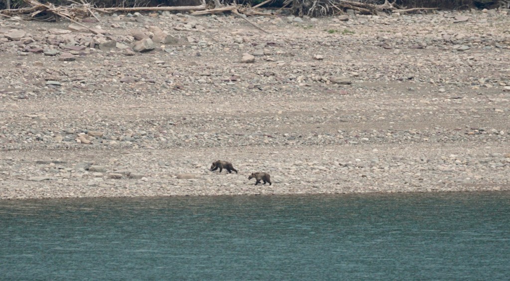 It’s hard to get a reservation for Many Glacier. The lodges fill up fast, the campground sites go quick, and so do the road reservations. We made sure we got to Many Glacier because we read that this is where the bears were. And what we read was right. We were lucky enough to get two nights in the Many Glacier Campground. We stayed in site 103. It was a little close to some of the other sites, but we still enjoyed our stay. Something to note about the Many Glacier Campground is that bears frequent this area during the summer. If bears are frequenting the areas, NPS may shut down sites or restrict soft sided camping. Two weeks before we were supposed to arrive, we received an email that our site was restricted to only hard-sided camping. We tent camp, so this did throw us a small curve ball. Our plan was to just sleep in the back of our car, but it all worked out as the bears moved on. We found that the campground was quiet but allowed easy access to hiking trails and and the service areas by Swiftcurrent Motor Inn. The picture below shows two bears hiking along the shoreline not far from the campground. We saw these two on two different nights