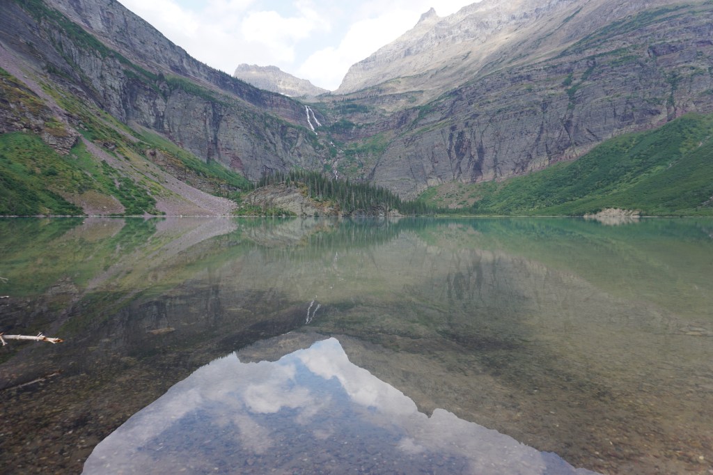 We saw evidence of moose all along the trail and expected one to pop out of the woods, but we never did. The lake is calm and restorative, just like the others in the Many Glacier area. Take time to sit and relax. Watch some of the falls cascading down from Upper Grinnell Lake and the Grinnell Glacier. If the water is calm, you can also get some great mirror images off the lakes.