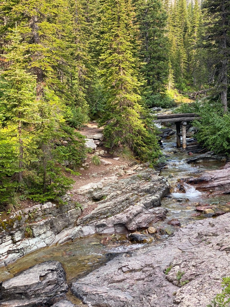 At the southern end of Lake Josephine, you will enter more tree cover and begin to follow a stream that connects Grinnell Lake and Lake Josephine. If there is a path, take a chance to check out the streaming water.