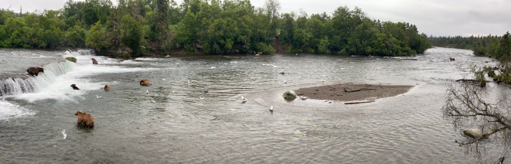Brooks Falls – The hike to Brooks Falls is about 1.4 miles from the visitor center. As you learn in Bear School, it is best to walk in a group and talk while are hiking in order to minimize encounters with bears on the trail. Bears always have the right of way on the trail. Humans have to wait for them. Even if they decide to take a nap in the middle of the trail. Keep this in mind as you are planning your day.